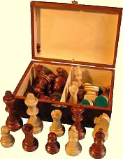 Bijna identiek aan (1) - zie Mumbai (India). Rode velt i.p.v. groen Winkelprijs € 7,50 (incl. BTW) Zes stuks: € 6,= franco. Gewicht: 490 gram. Koning (hoog) 95 mm. Verpakt in twee zakken. Binnencarton: 8 stuks Export carton: 32 stuks. Gross: 19,5 kg. Witte stukken komen in kleur ivoor. Opbergzak in kleuren rood en blauw voor extra prijs per schaakstel van € 2,80. Goede korting bij grotere aantallen. Zie ook bijbehorende borden in maten 45x45mm, 50x50mm en 55x55mm per veld. |